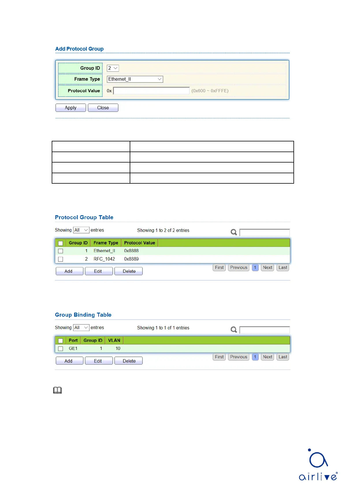 4. Click the “VLAN > Protocol VLAN > Group Binding” in the navigation bar to bind the