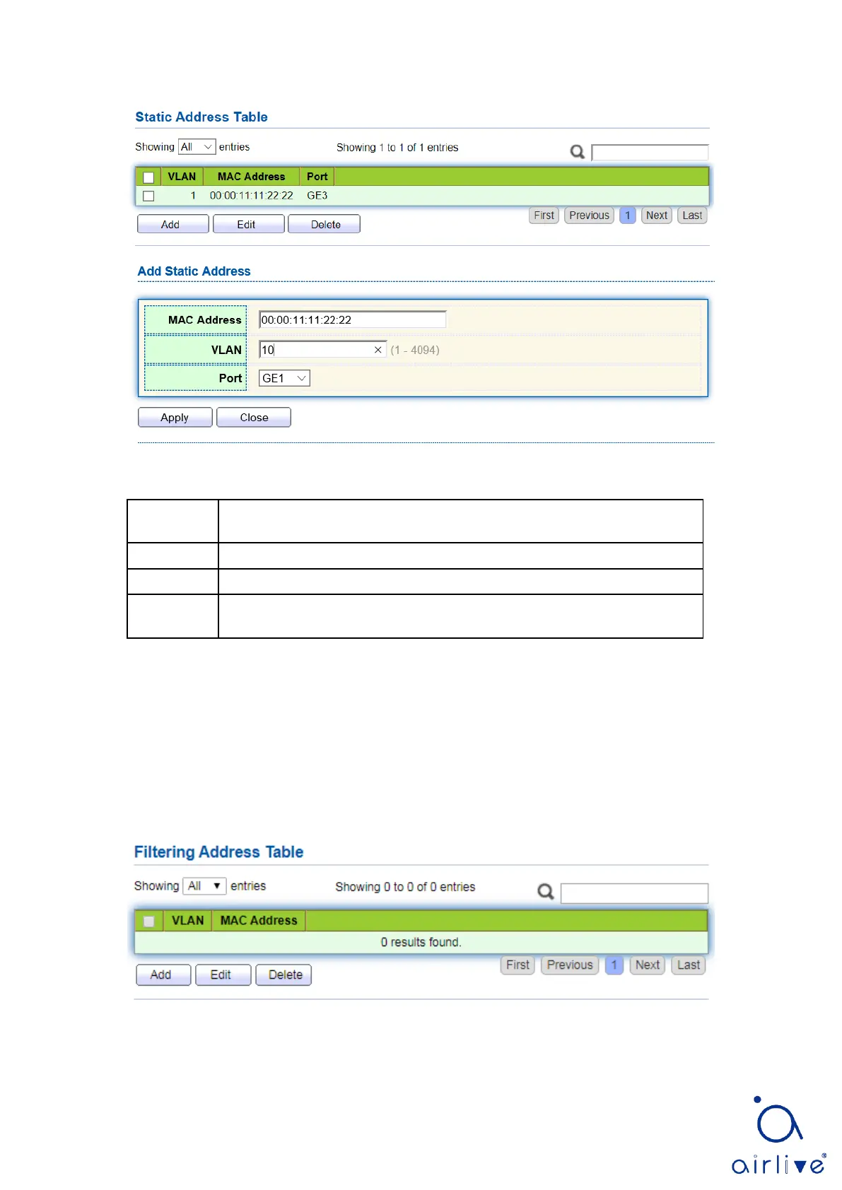 1. Click the “MAC Address Table > Filtering Address” as follows:
