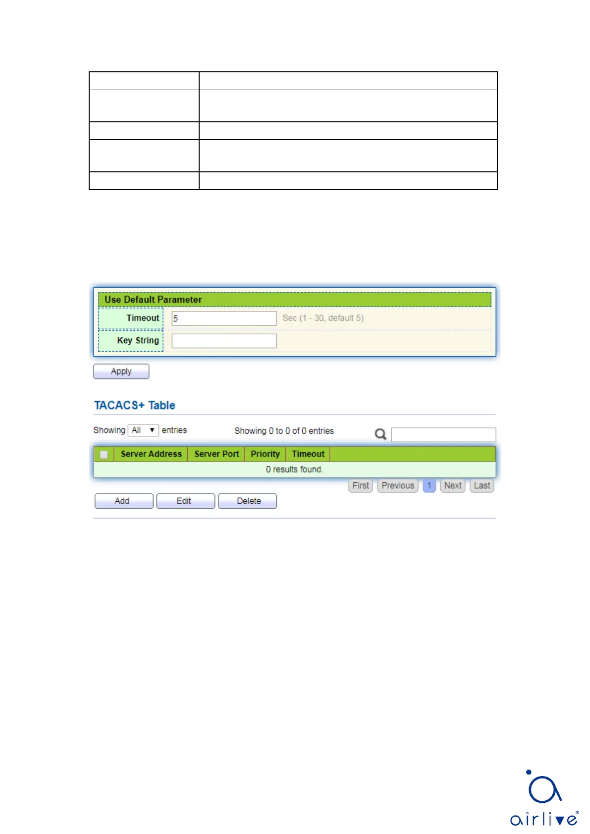 1. Click the “Security > TACACS+”, enter TACACS+ interface as follows:
