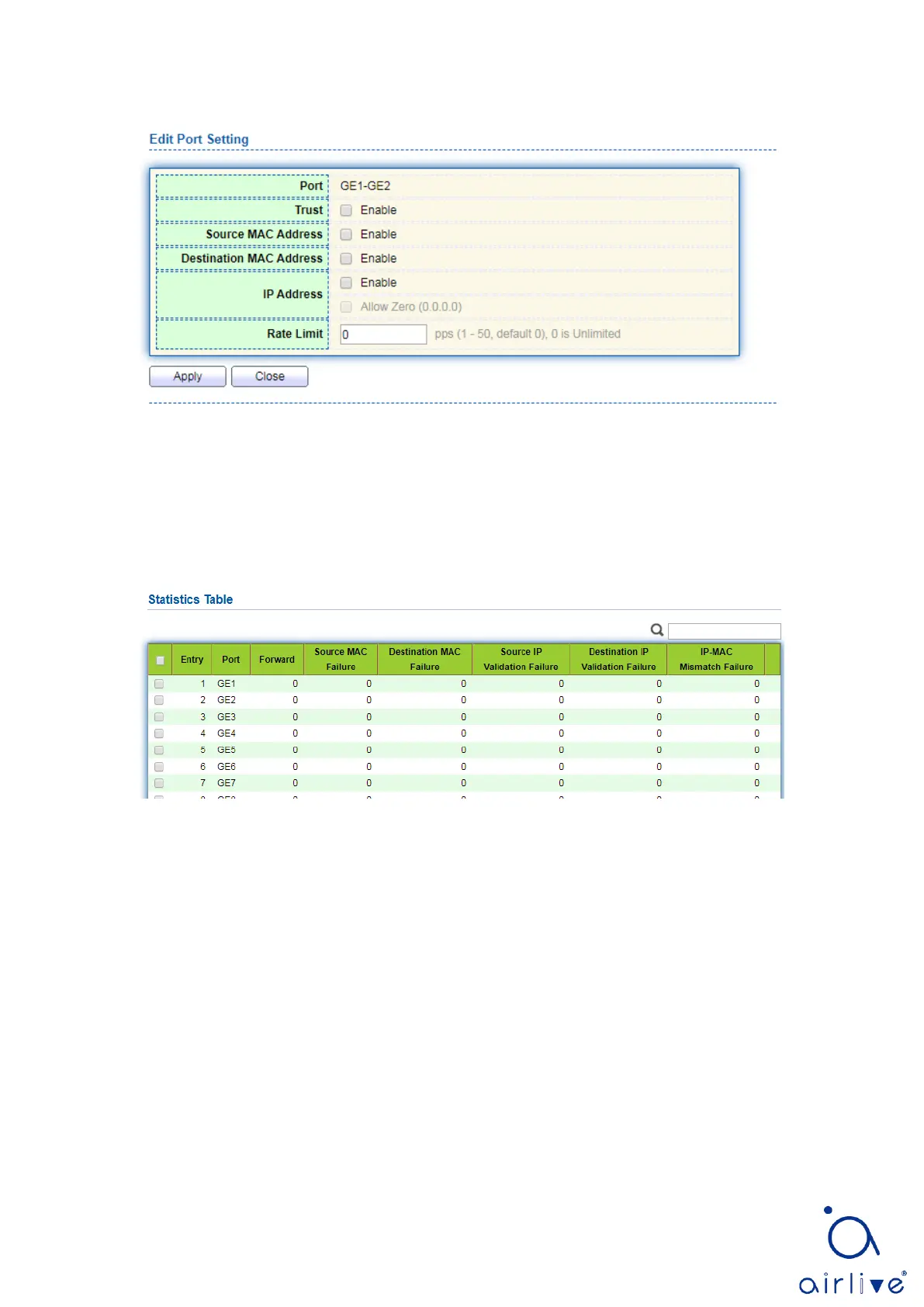 1. Click the “Security > Dynamic ARP Inspection > Statistics” view DAI statistics as follows: