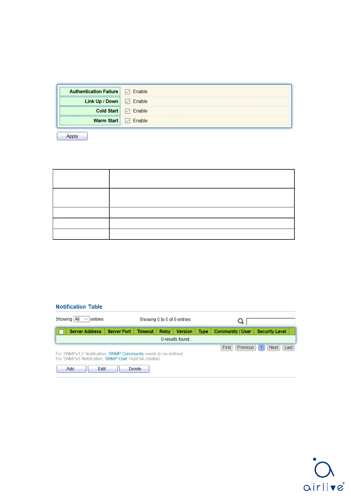 1. Click the “Management > SNMP > Notification” in the navigation bar as follows.
