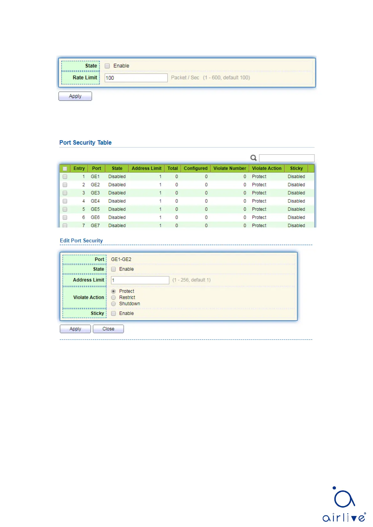 2. Click the “Port > Port Security” in the navigation bar, select the port and “Edit” to enter