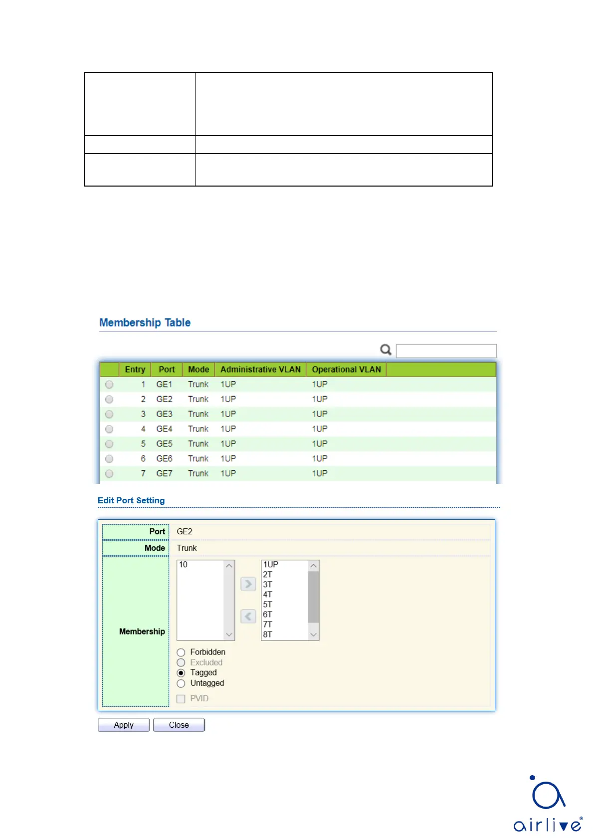 1. Click the “VLAN > VLAN > Membership” in the navigation bar, select the port to be