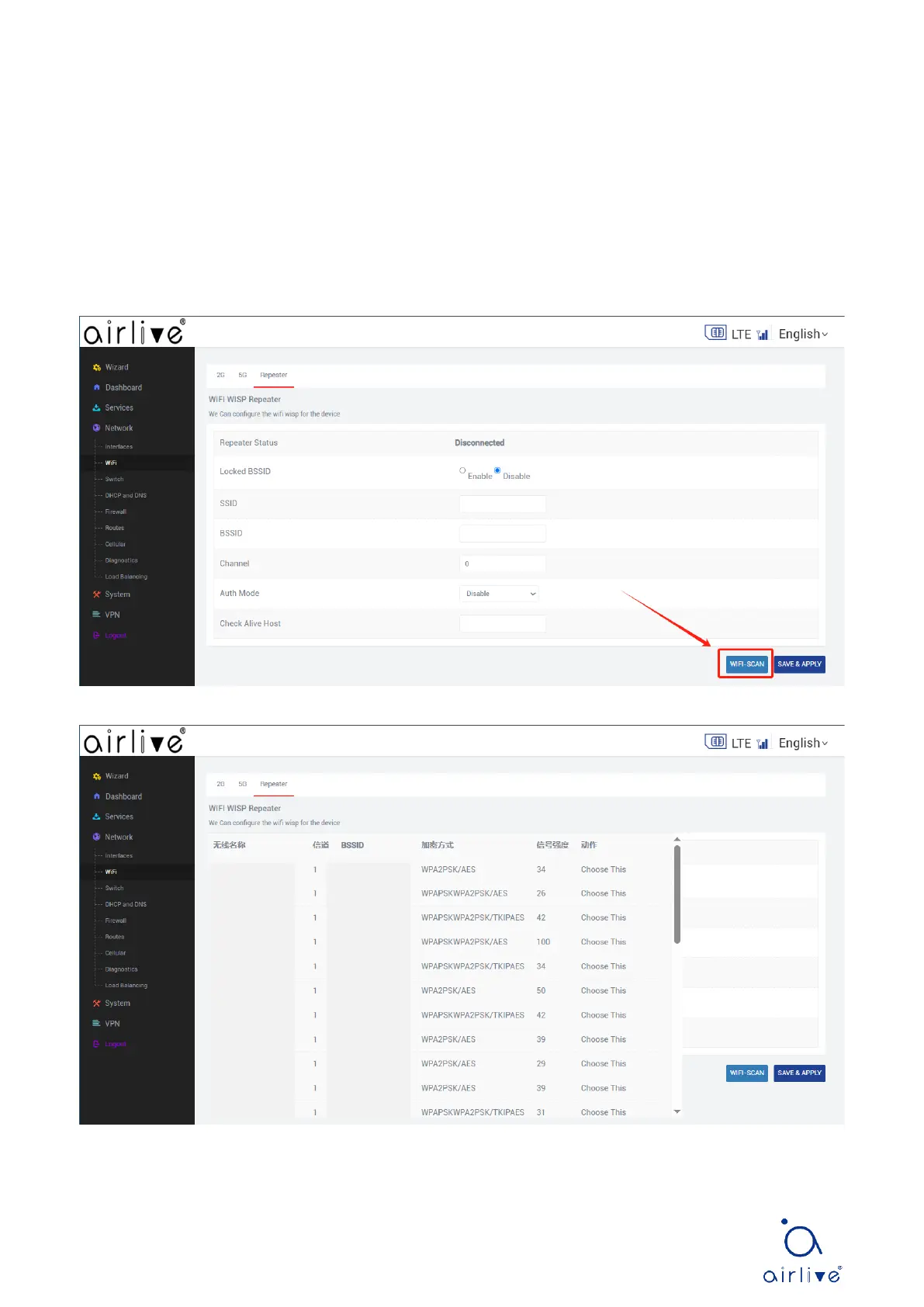 1. Open the configuration page of "Network" --> "Wi-Fi"--> "Repeater". Click "WI-FI-SCAN" to search