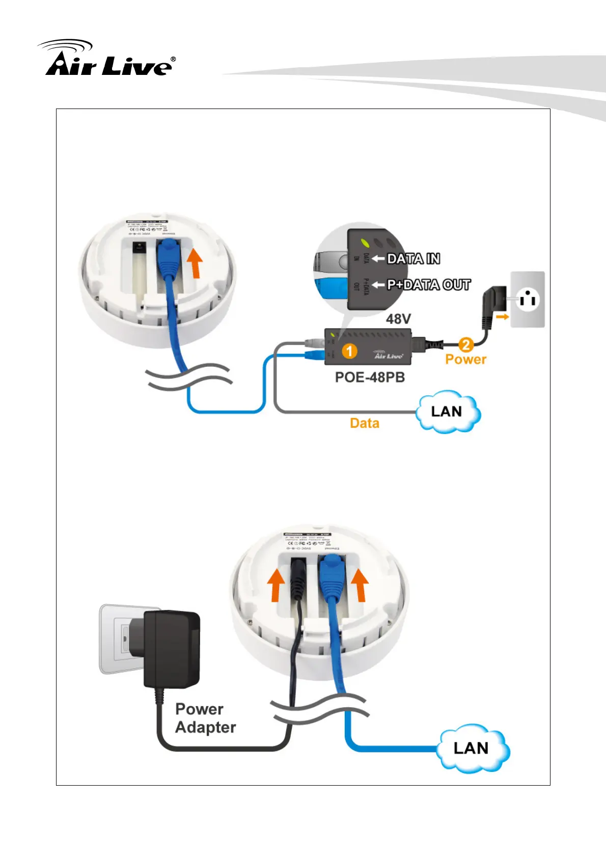 N.TOP is equipped with 802.3af compliant PoE port. You can select AirLive PoE-48PB for