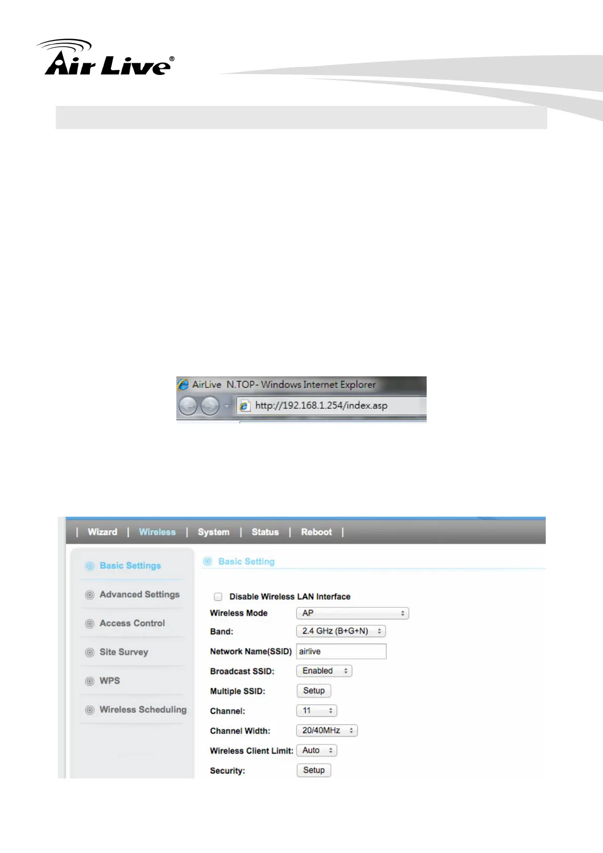 (default IP is 192.168.1.254) into the web browser’s address field.