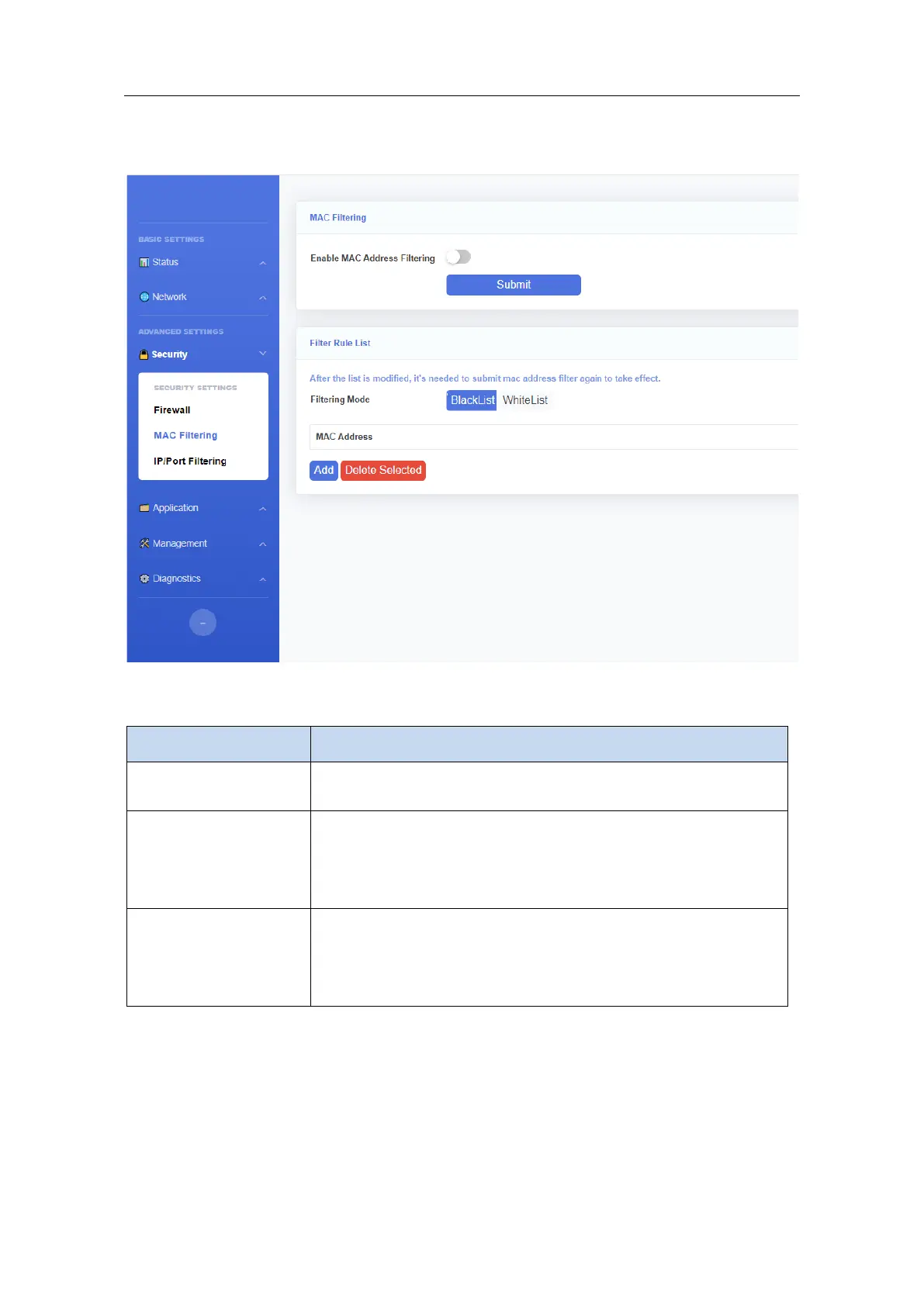 This page allows you to configure MAC address filters. When a packet enters a LAN