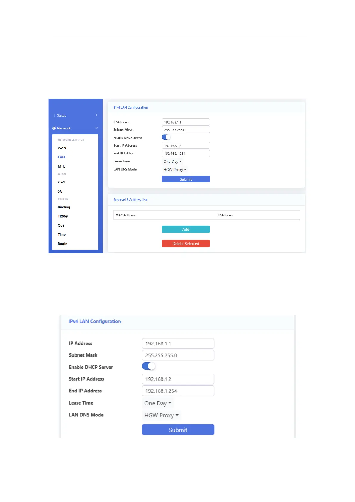 This page allows you to set up LAN, including IP, enable DHCP server, and reserve IP