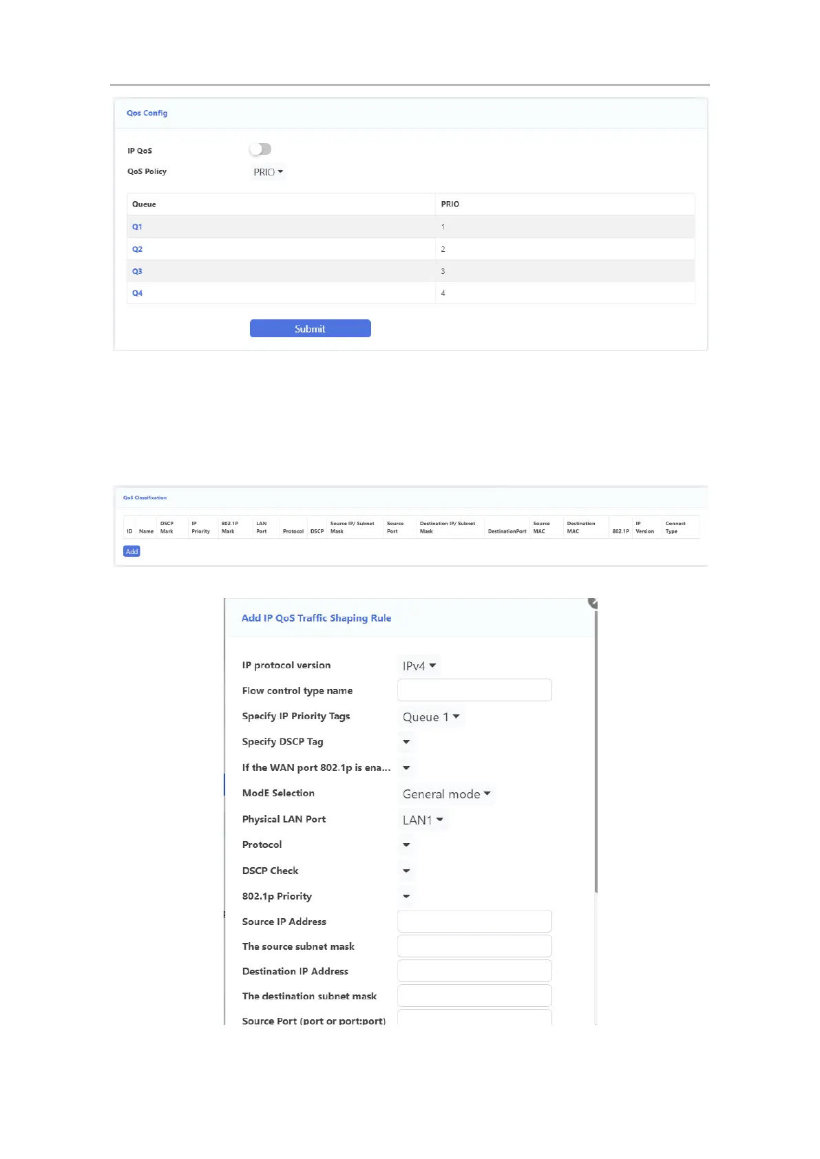 This page is used to configure the QoS classification. Click on the "Add" button to add