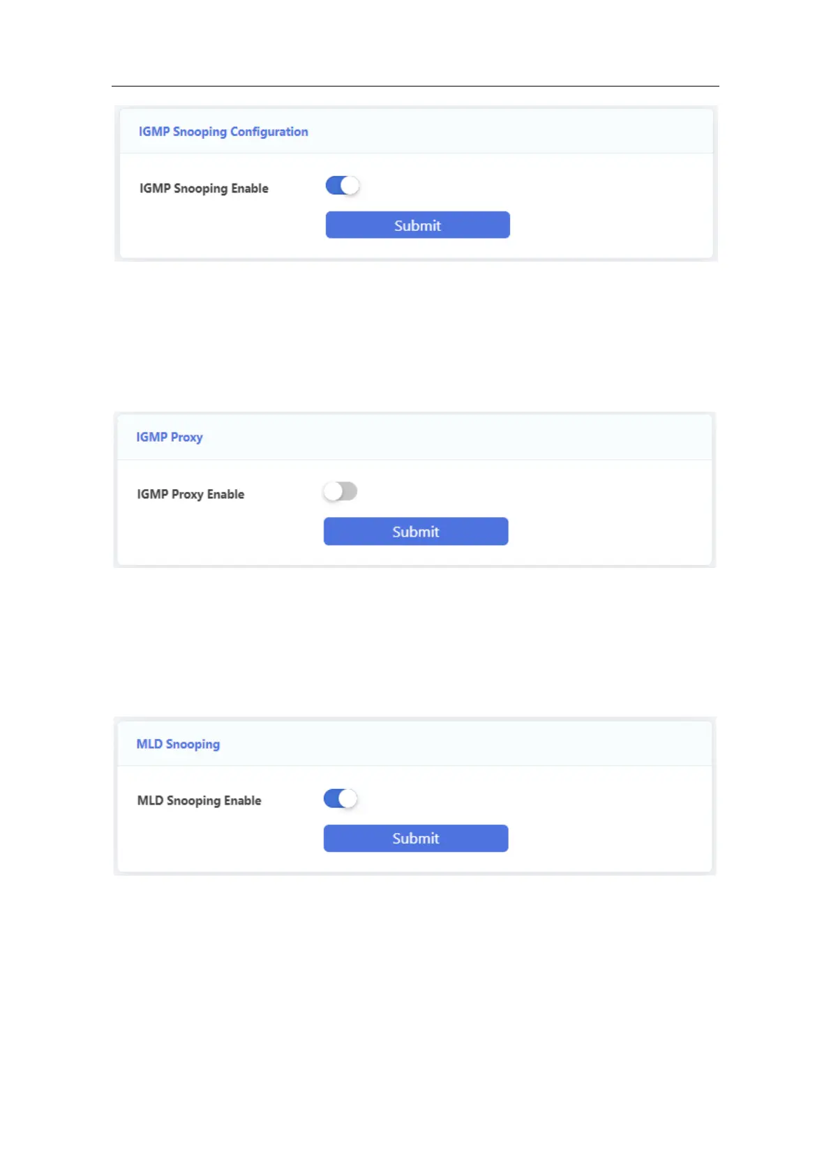 This page allows you to enable or disable the MLD snooping function for IPv6, just like