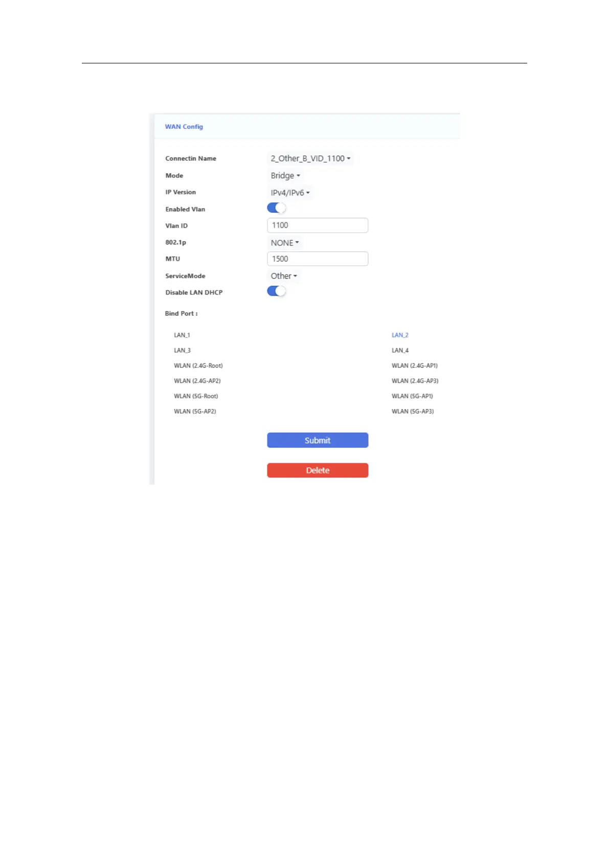 Add a bridge mode WAN connection for IPTV service. Enable VLAN and its VLAN ID is