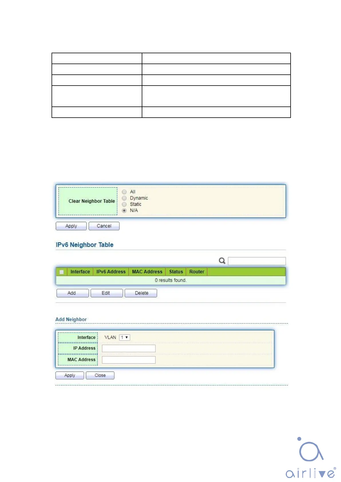 1. Click the “Routing > IPv6 Management and Interfaces > Neighbors”, configure and