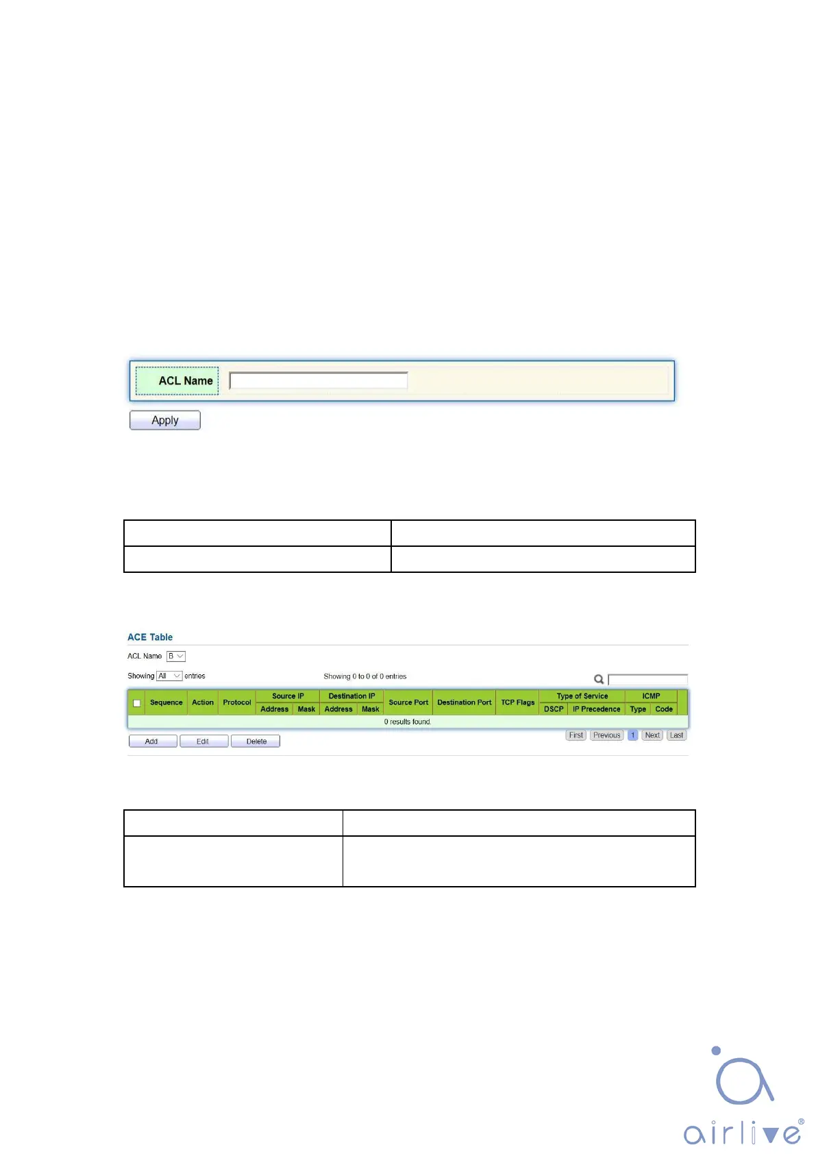 2. Click on the “ACL > IPv4 ACE” in the navigation bar, “Add” the ACL Name as follows: