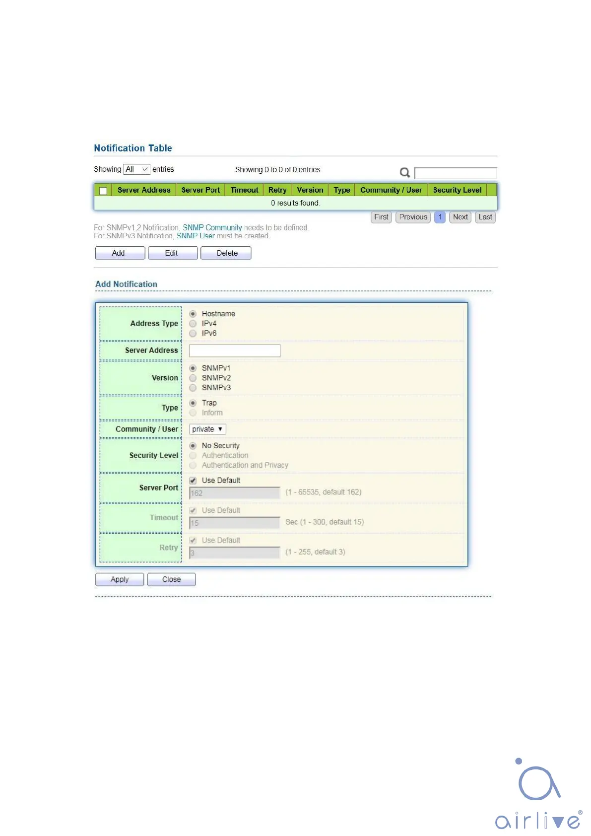1. Click the “Management > SNMP > Notification” in the navigation bar as follows.