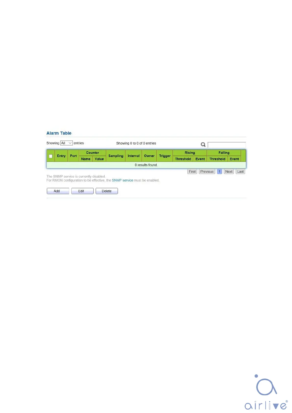 1. Click the “Management > RMON > Alarm” in the navigation bar as follows.