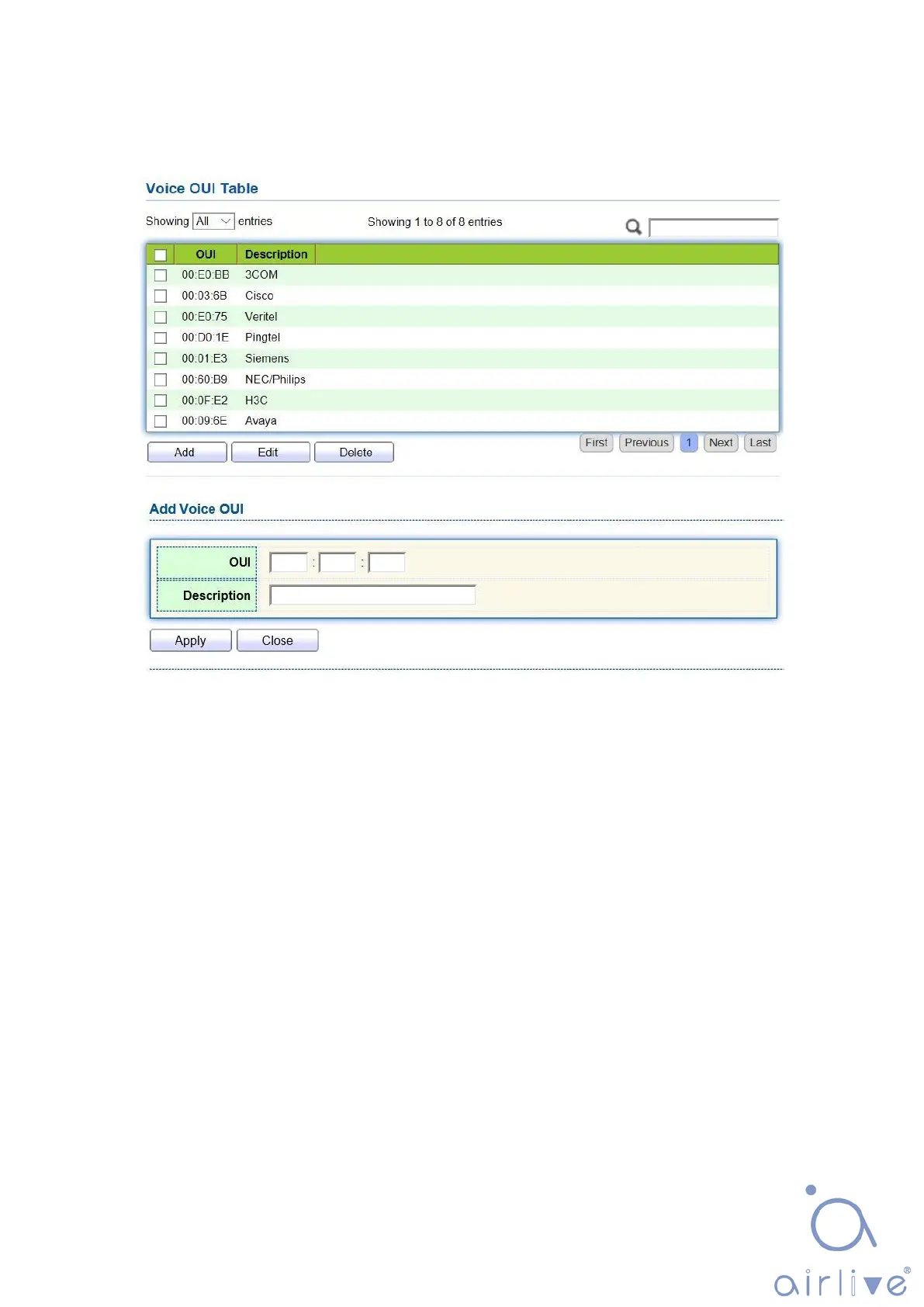 2. Click the “VLAN > Voice VLAN > Voice OUI” in the navigation bar to configure the