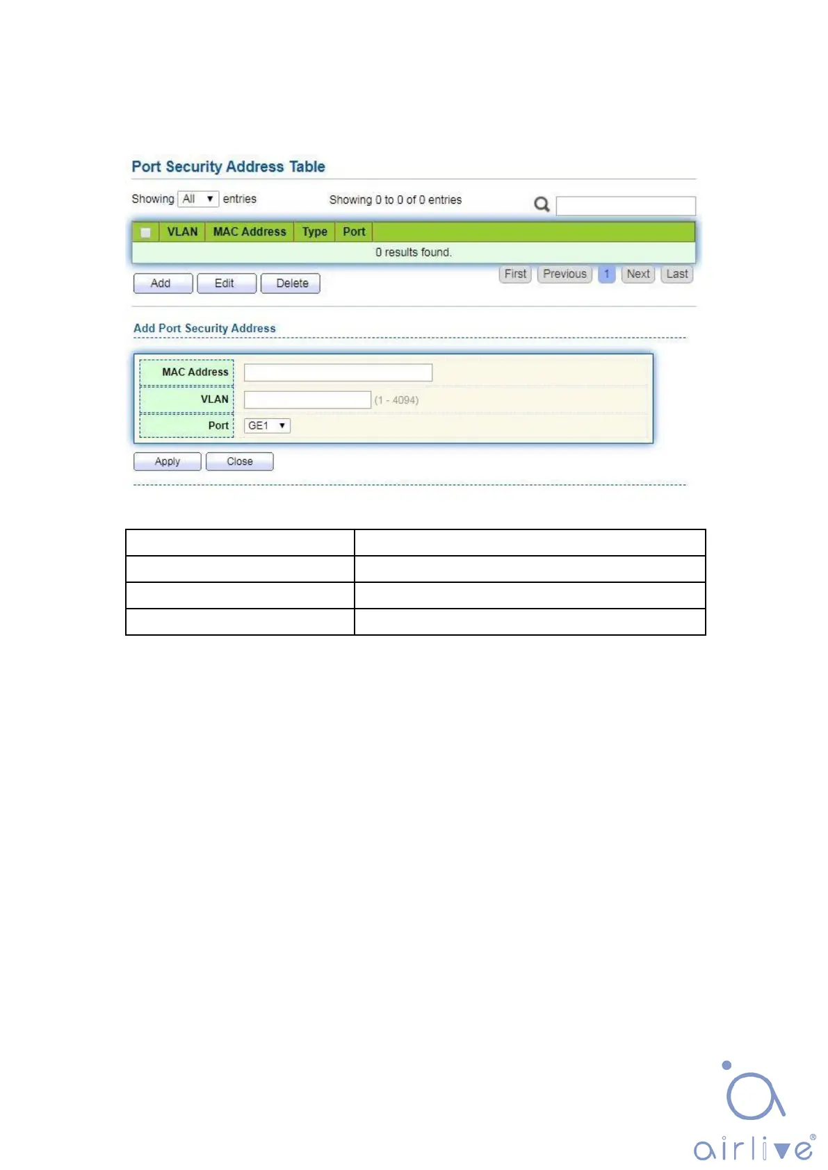 1. Click the “MAC Address Table > Port Security Address” as follows: