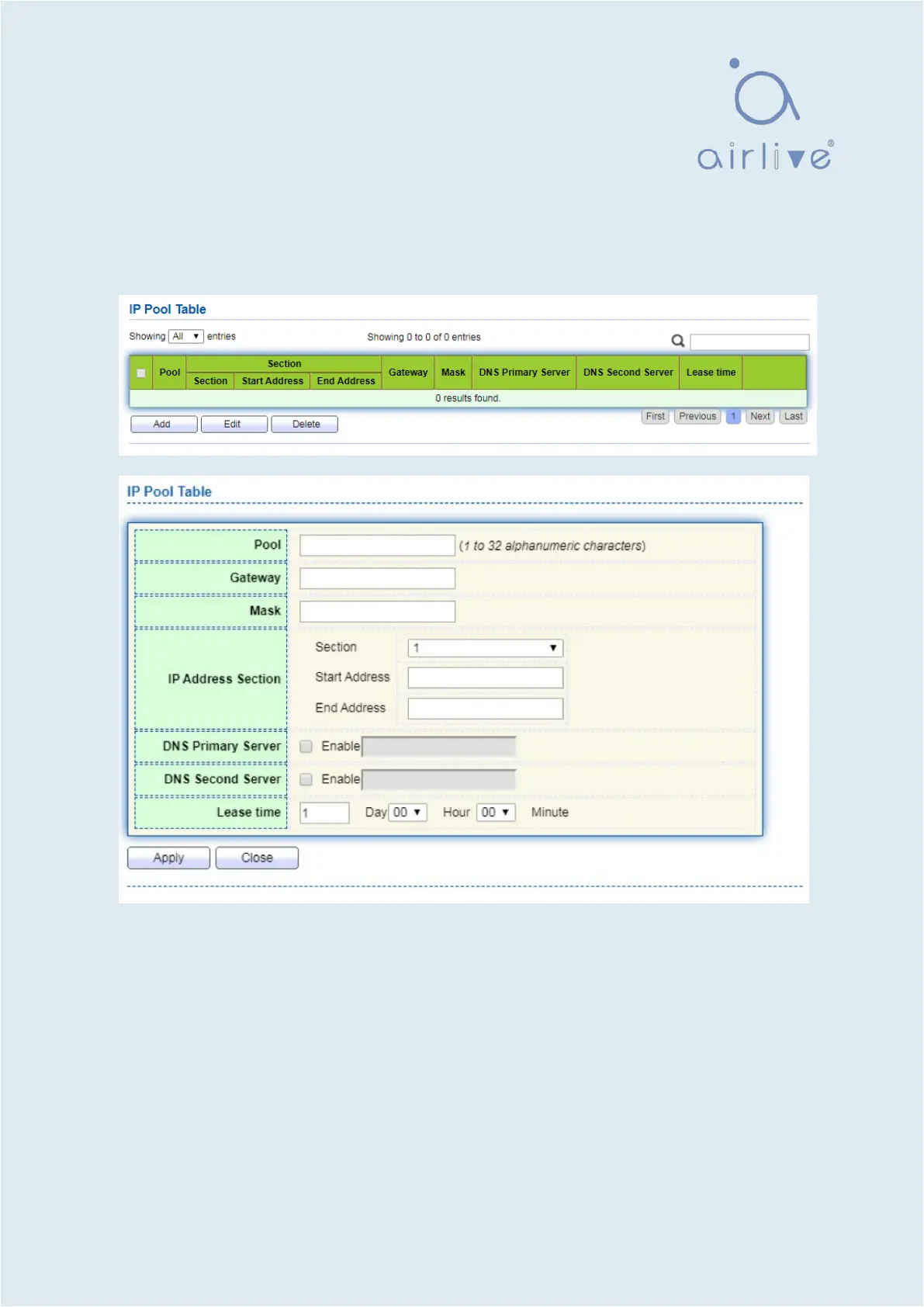 1. Click the “DHCP > IP Pool Setting”, Click Add” to add IP pool as follows.