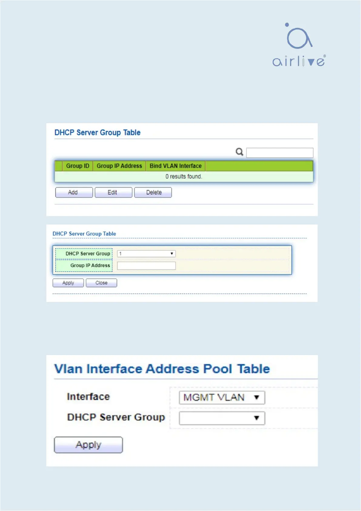 1. Click the “DHCP > VLAN IF Address Group Setting”, enter the DHCP Server