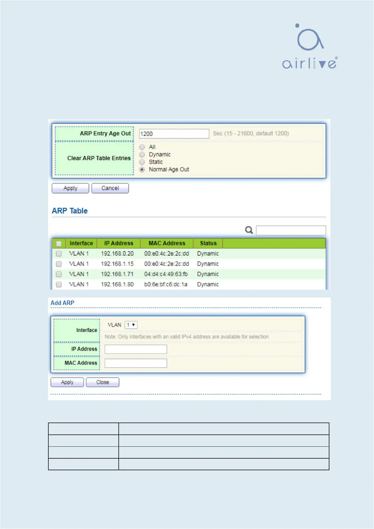 1. Click the “Routing > IPv4 Management and Interfaces >ARP”, configure and view