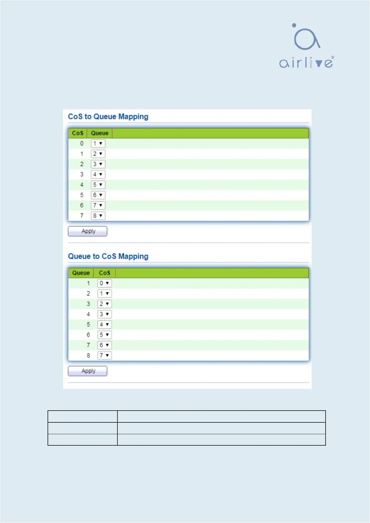 1. Click the “QoS > General > CoS Mapping” in the navigation bar. “Apply” and finish