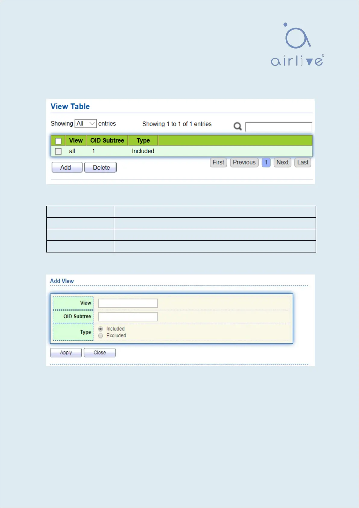 1. Click the “Management > SNMP > View” in the navigation bar as follows.