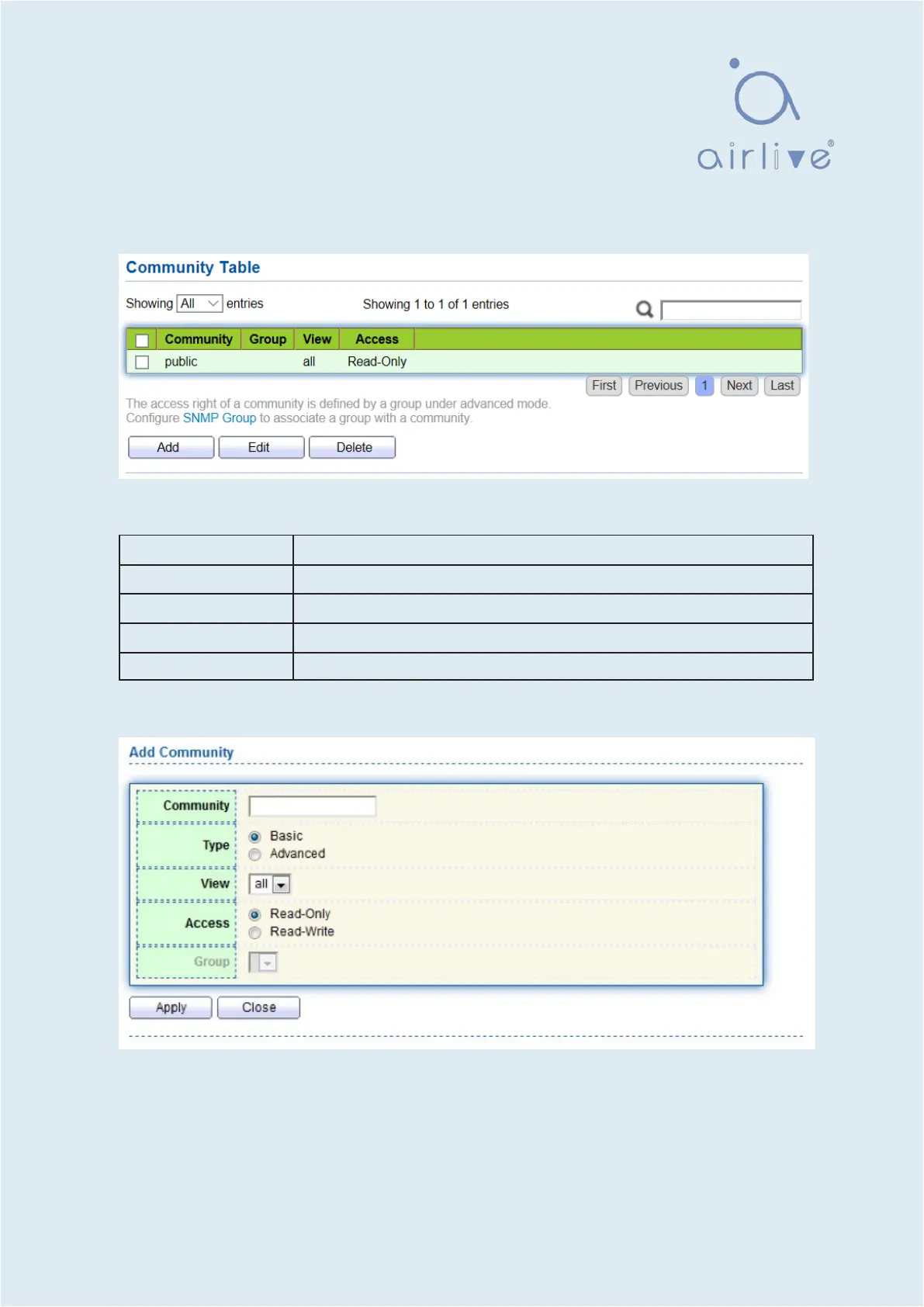 1. Click the “Management > SNMP > Community” in the navigation bar as follows.