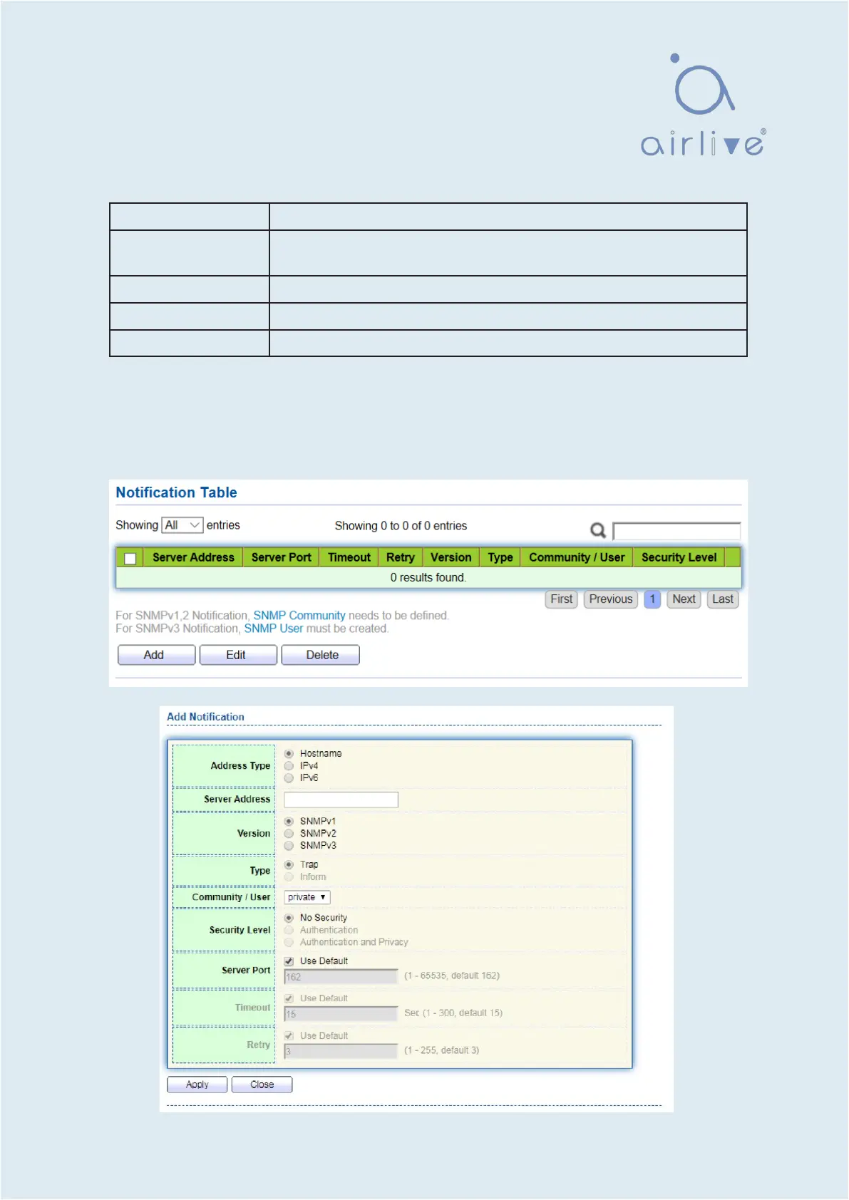 1. Click the “Management > SNMP > Notification” in the navigation bar as follows.