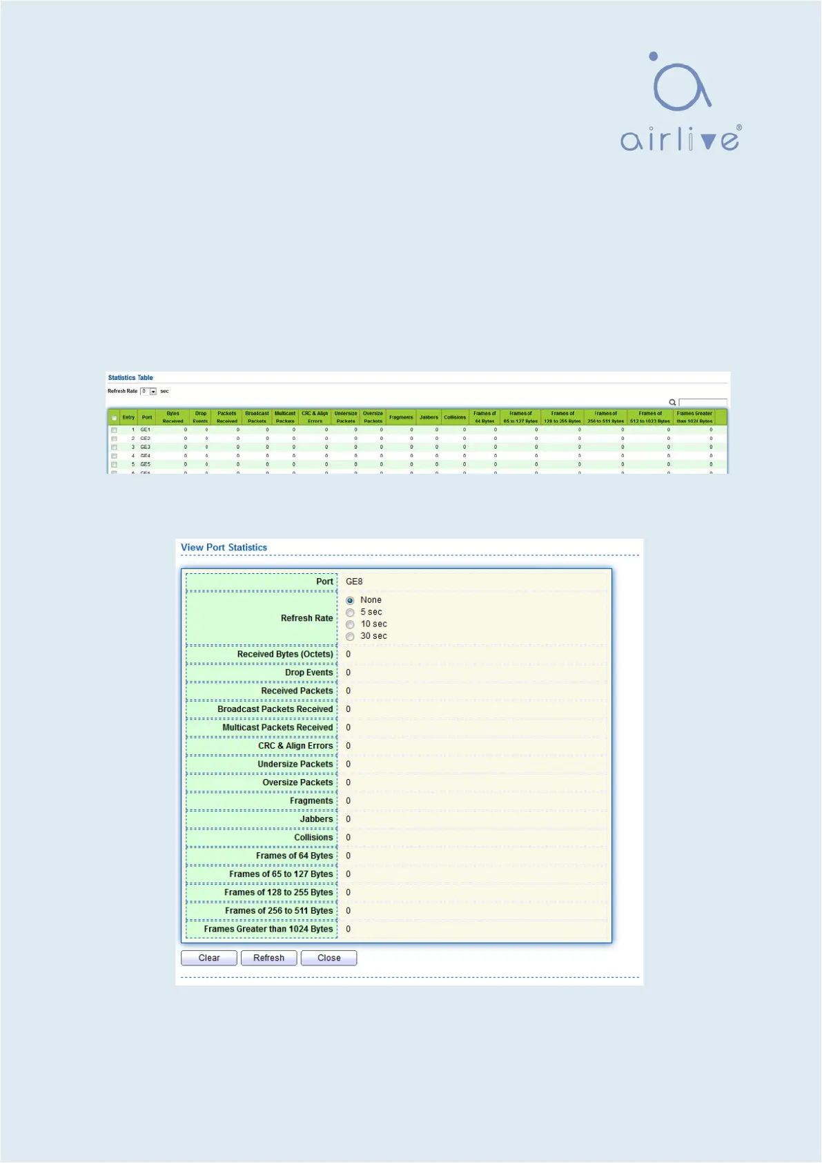 2. “Clear” and “Refresh” the statistics of the selected port. “View” such statistics