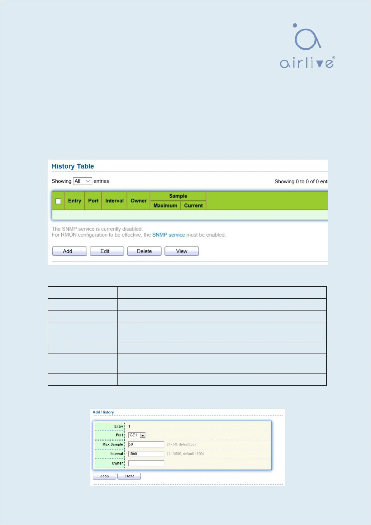 1. Click the “Management > RMON > History” in the navigation bar as follows.