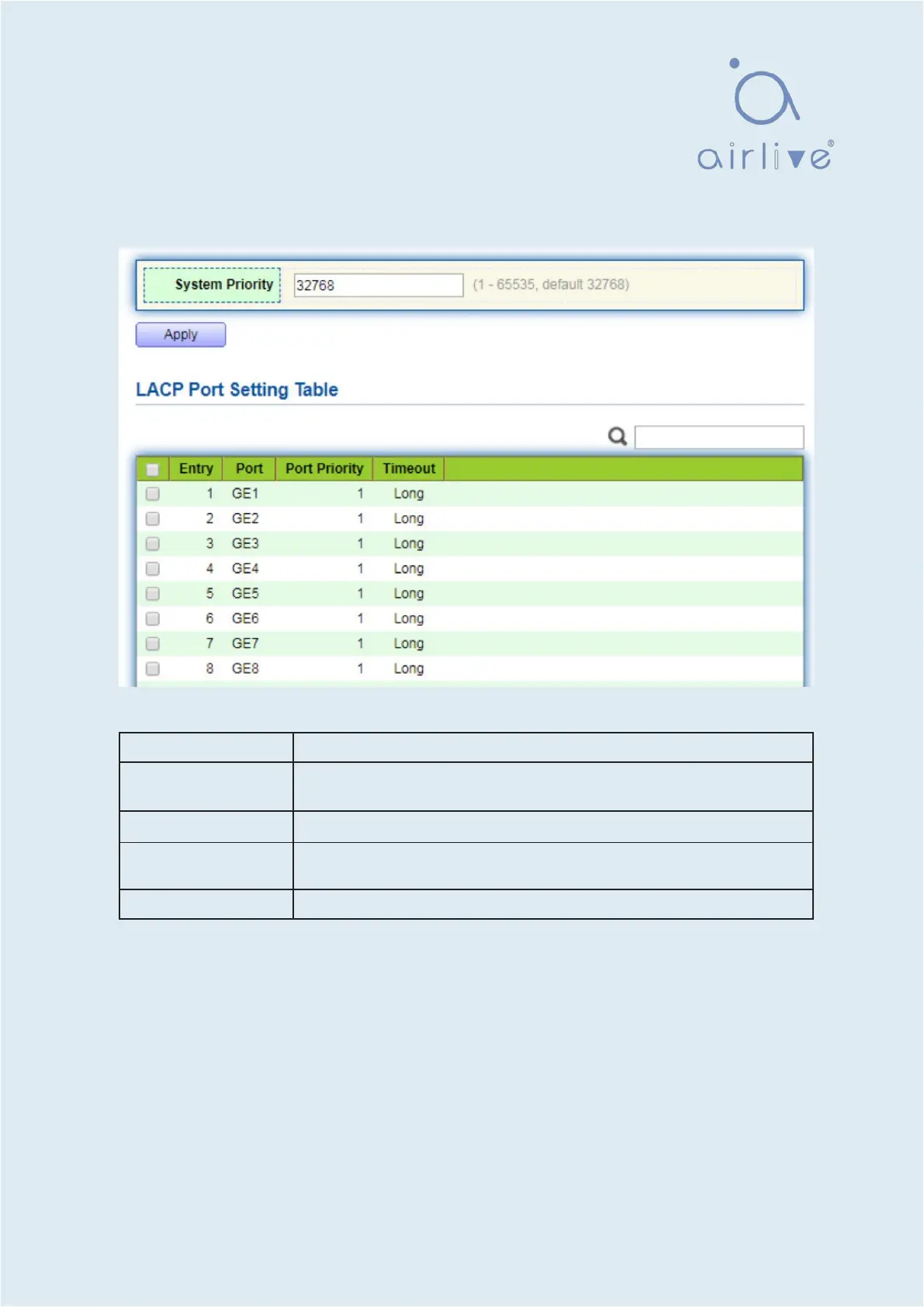 2. Click the “Port >Link Aggregation > LACP” in the navigation bar to configure the