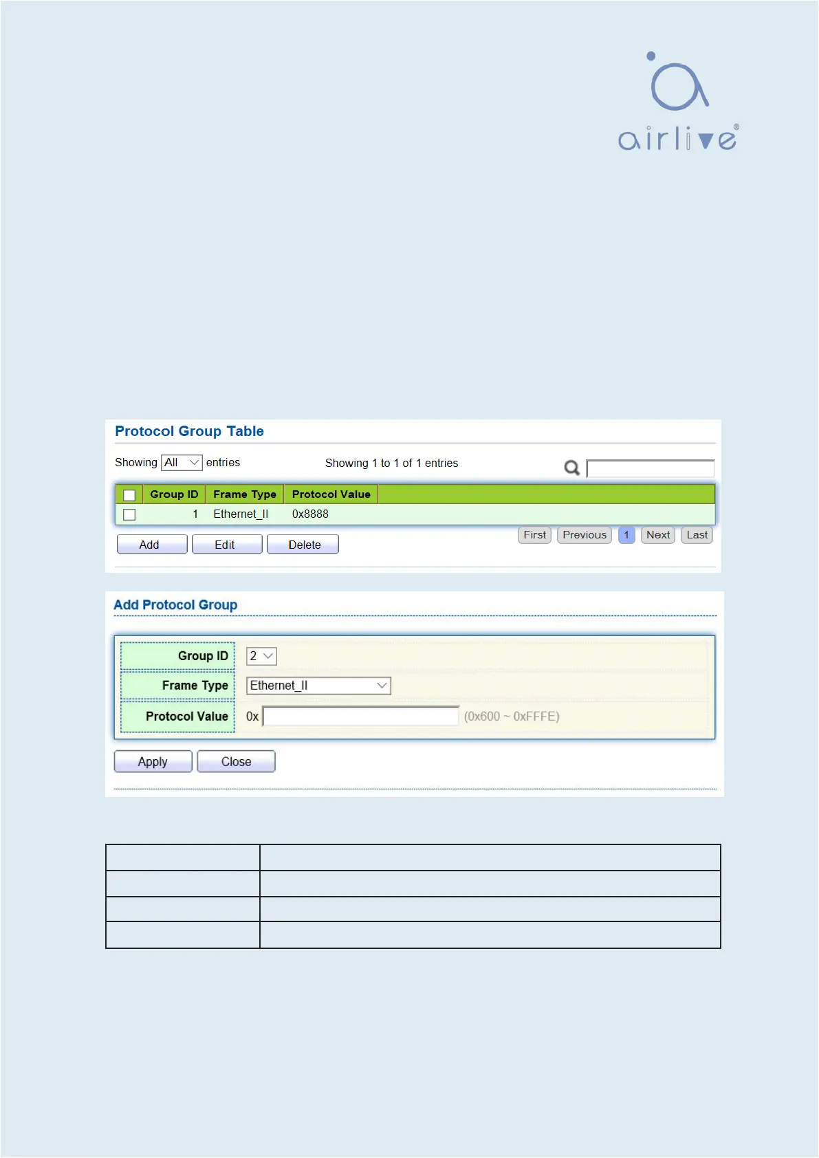 1. Click the “VLAN > Protocol VLAN > Protocol Group” in the navigation bar as
