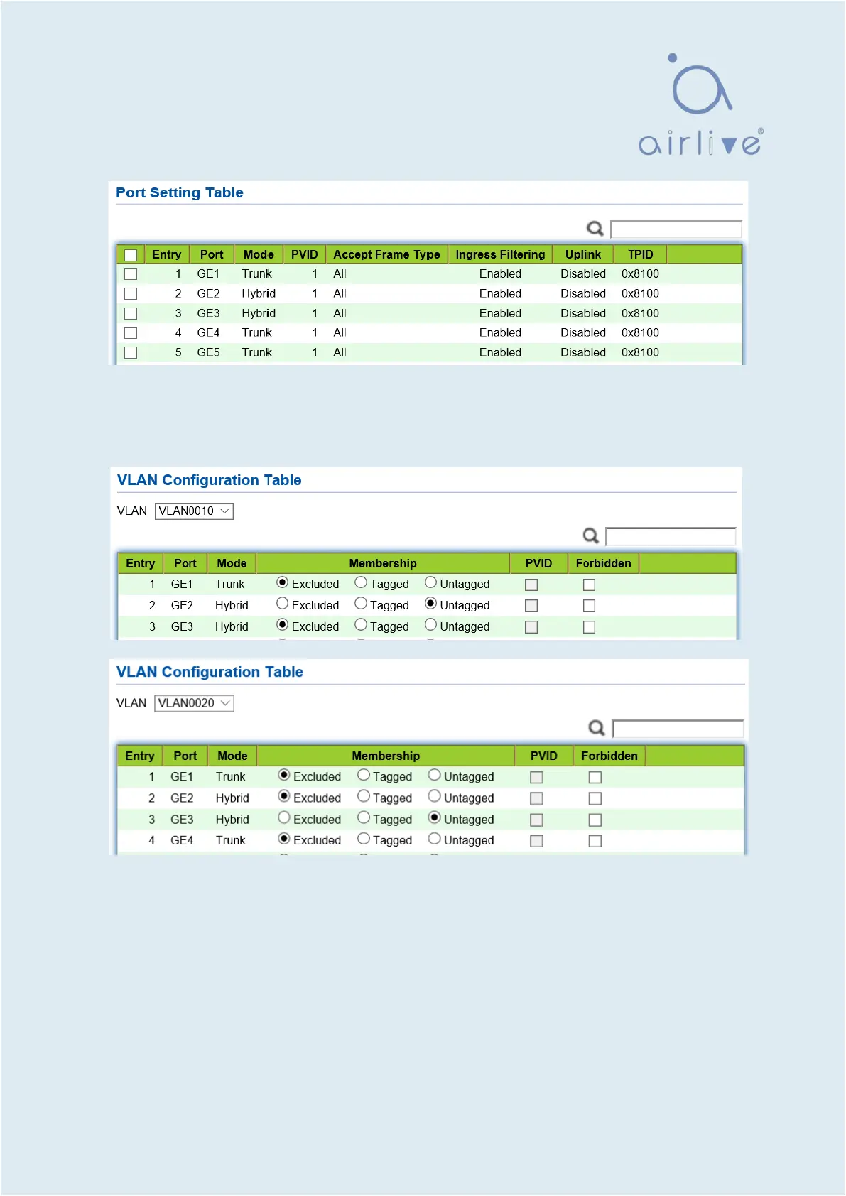 VLAN > VLAN Configuration”, drop down the list to select VLAN10 and the Tagged member