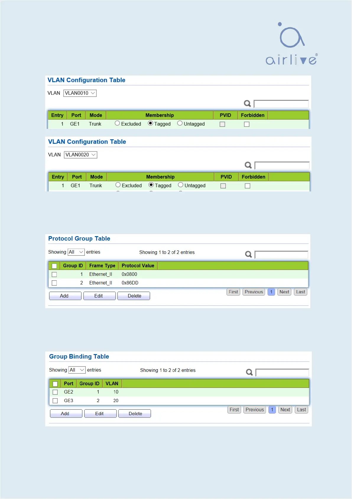 “VLAN > Protocol VLAN > Protocol Group” in the navigation bar to add 2 rules for protocol