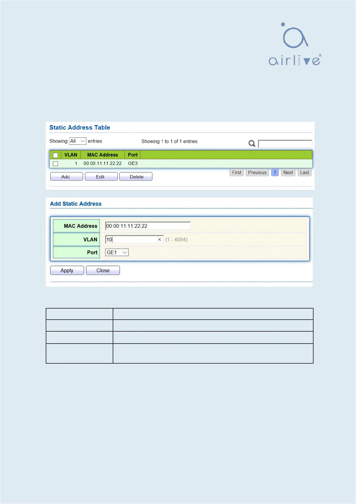 1. Click the “MAC Address Table > Static Address” as follows: