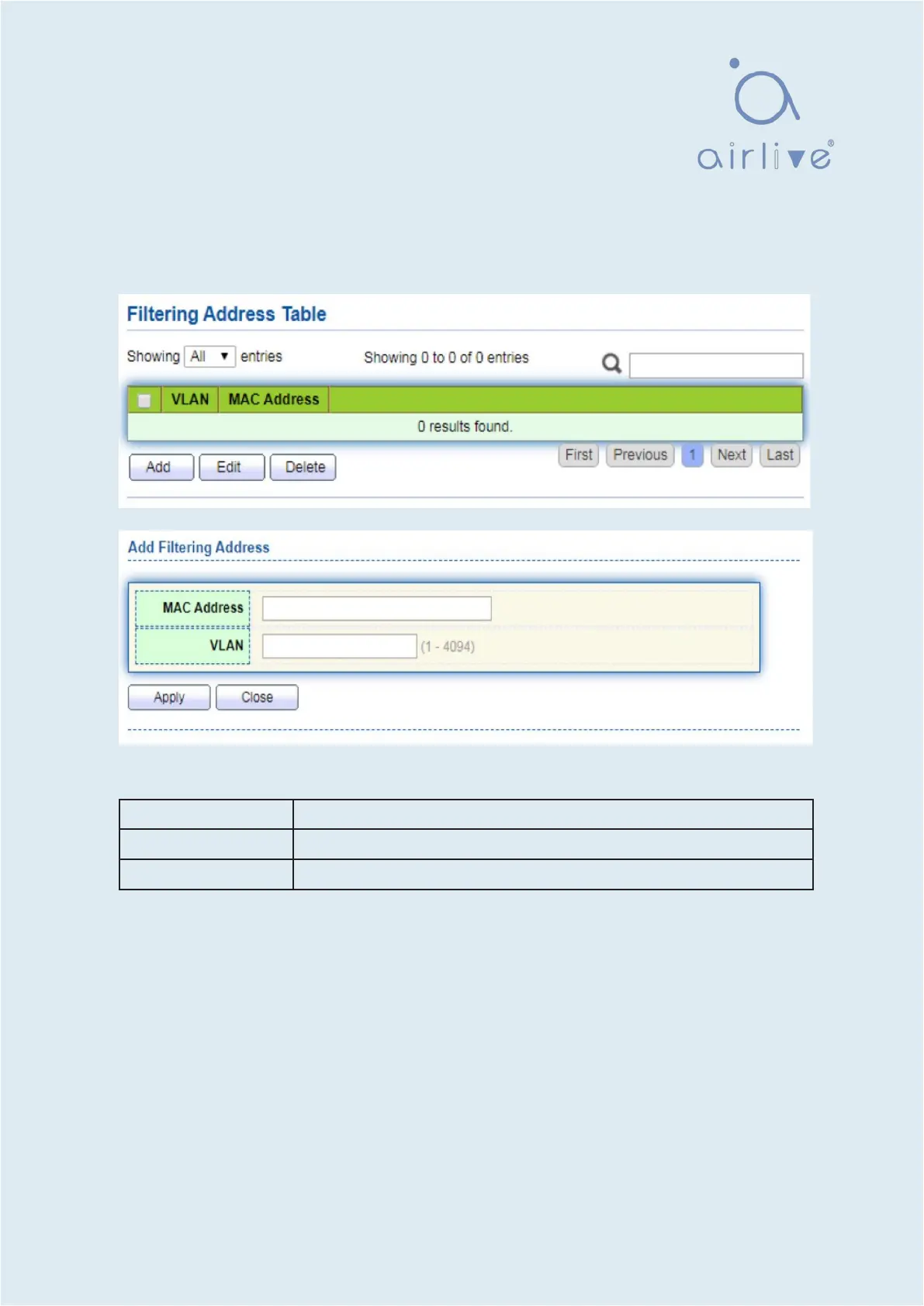 1. Click the “MAC Address Table > Filtering Address” as follows: