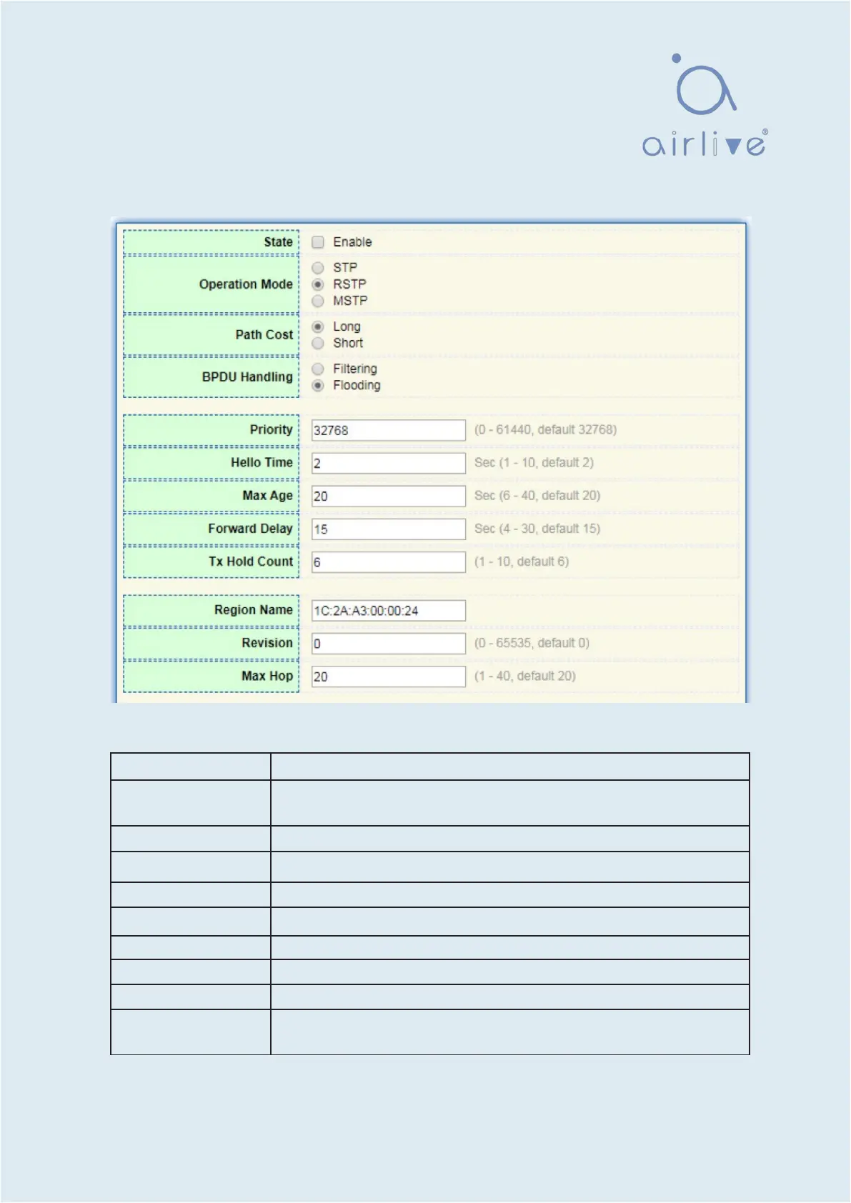 Operation Mode 3 modes are available, namely STP, RSTP and MSTP.