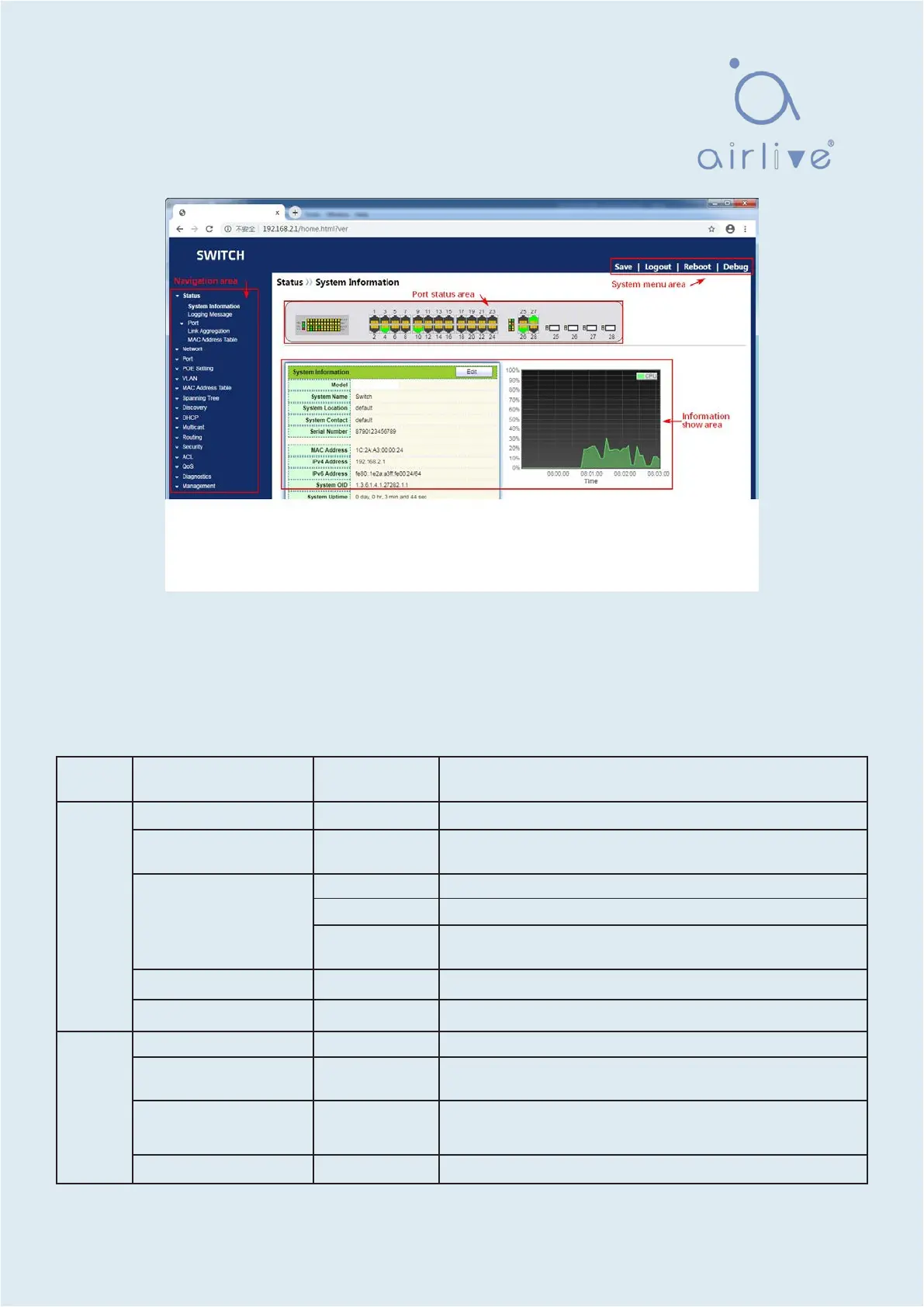 Menu items such as State, Network, Port, PoE setting, VLAN, MAC Address Table, Spanning Tree,
