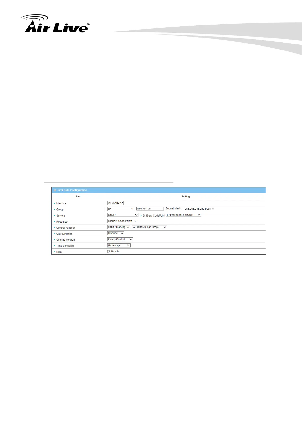 Control Function: Select “DSCP Marking” with “AF Class2 (High Drop)”.