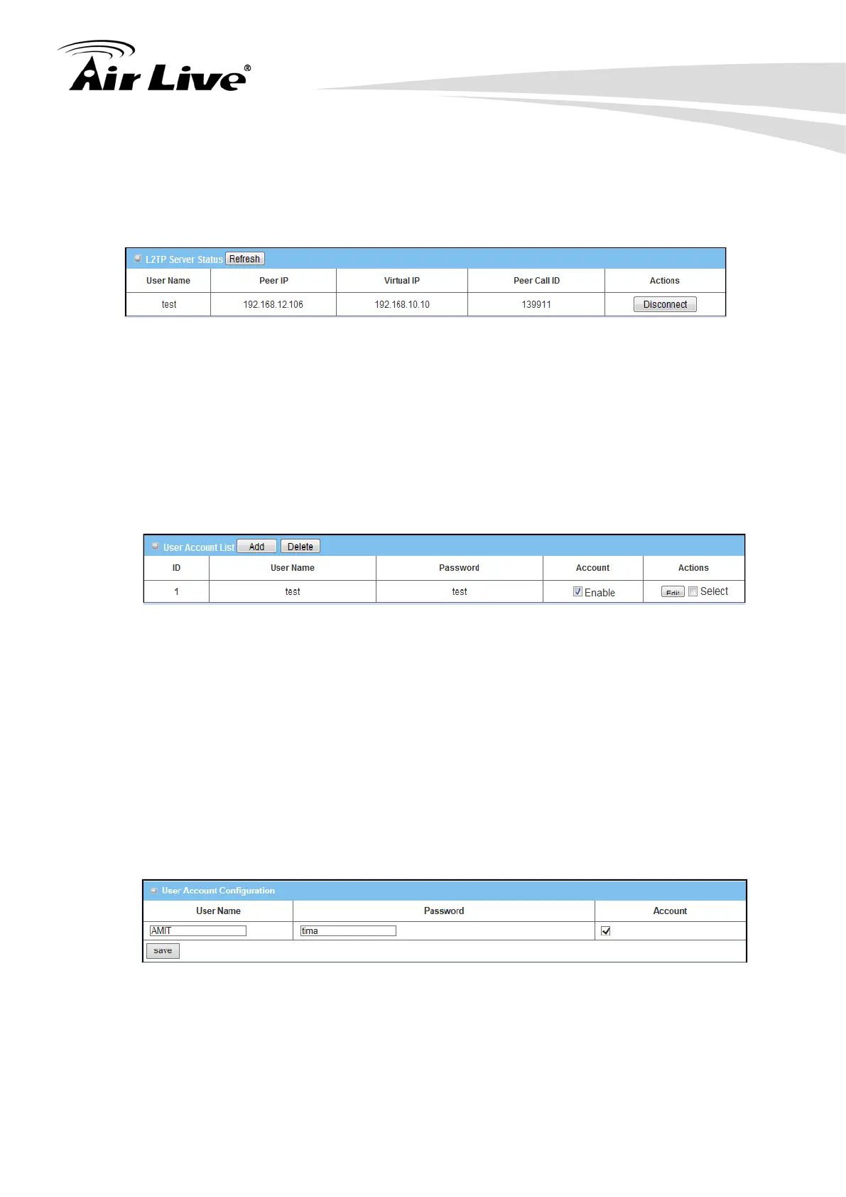 You can input up to 10 different user accounts for dialing in L2TP server.