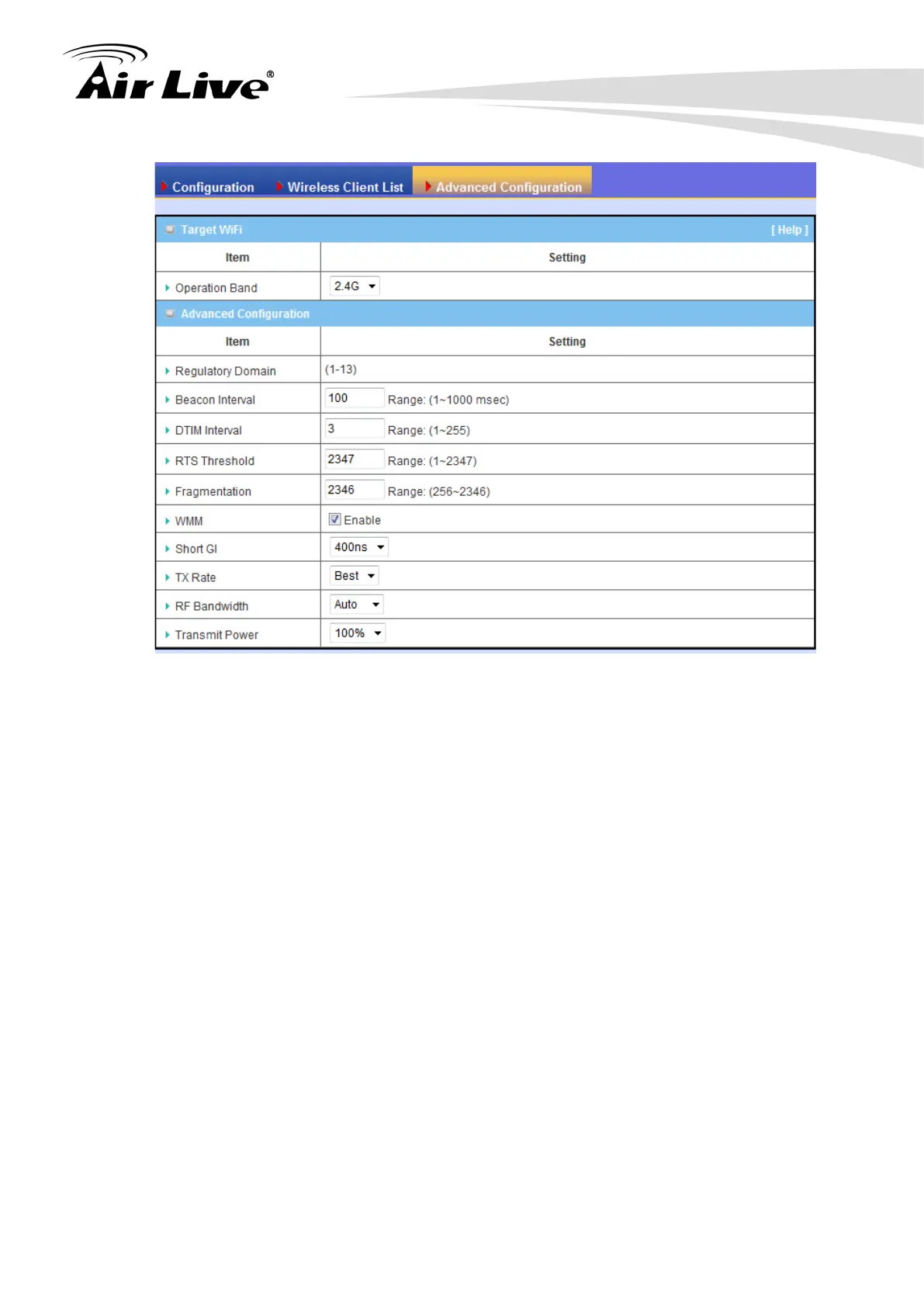 Select the WiFi operation band that you want to configure.