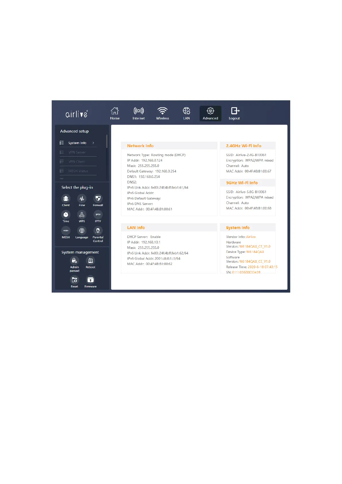 System Information: Displays all the detailed router information, Network Info, LAN, 2.4Ghz