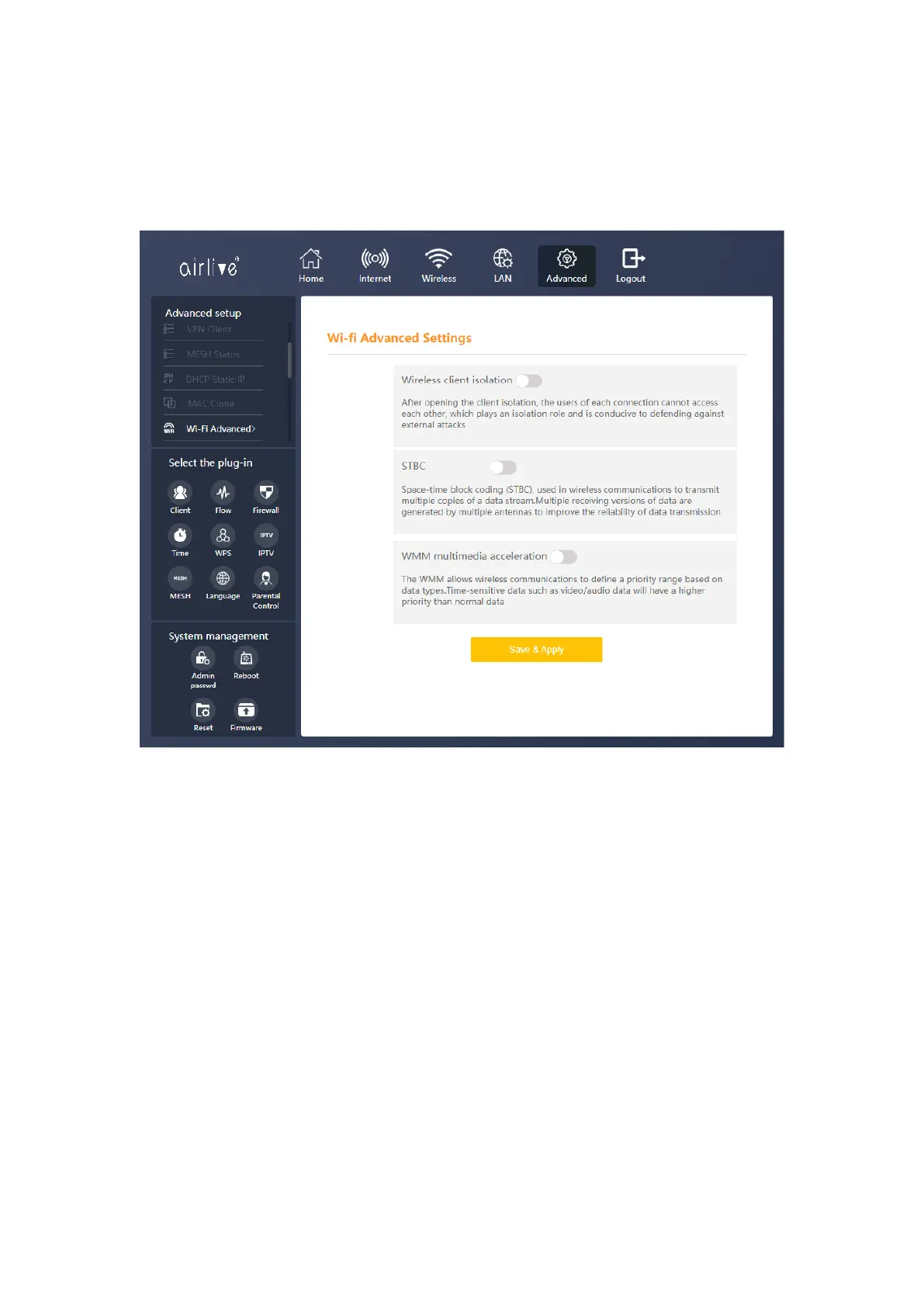 Wireless Client Isolation, STBC and WMM can be turned on.