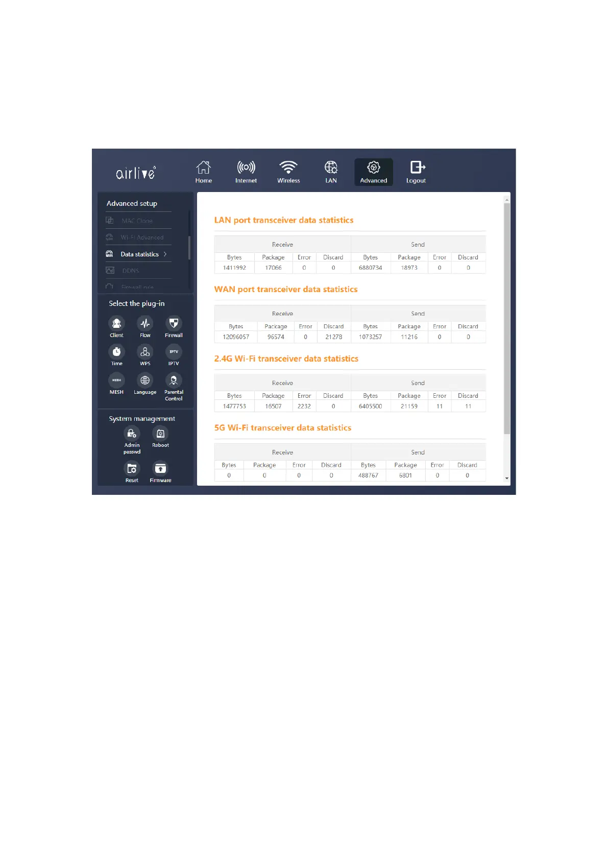 WAN, LAN and both the 2.4GHz and 5Ghz transmission data is shown.