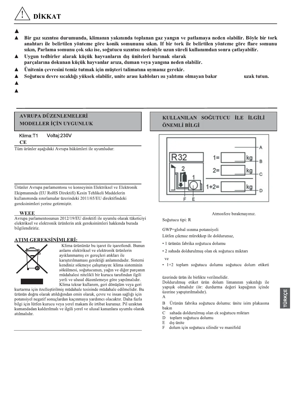 Cihazın bakımı ve soğutucu gazın uzaklaştırılması işlemi, sadece nitelikli personel tarafından yapılmalıdır.