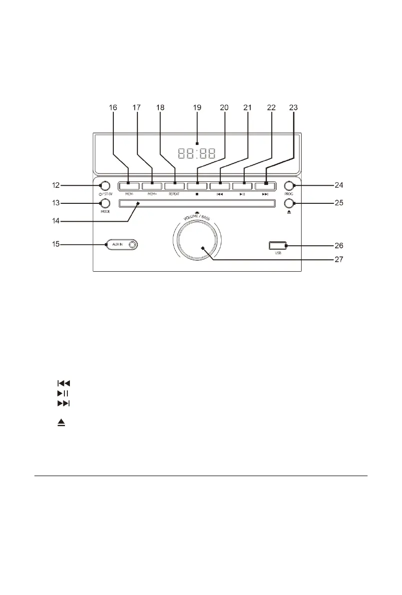 13. Mode Function: Press the button to select CD, USB, BT, PHONO, FM or AUX IN.