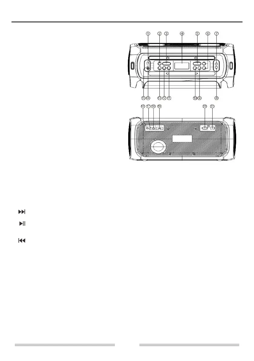 13. : Prejdite na predchádzajúcu skladbu v režime vstupu USB/BT. Prejdite na predchádzajúcu stanicu v režime