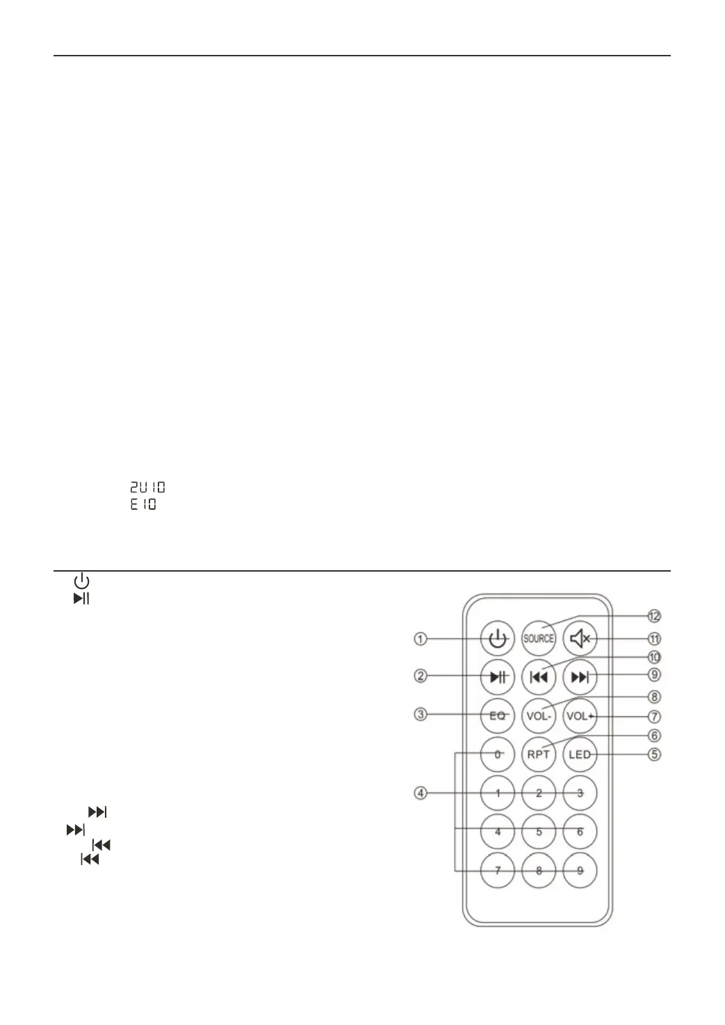 12. SOURCE: Naciśnij, aby zmienić źródło, wybierając pomiędzy USB, BT, FM, LINE