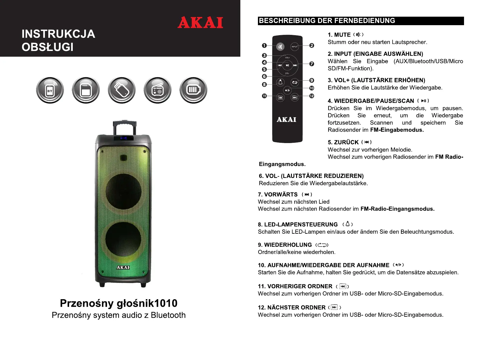 Bekijk gratis de handleiding van Akai Party Speaker 1010, stel vragen en lees de antwoorden op veelvoorkomende problemen, of gebruik onze assistent om sneller informatie in de handleiding te vinden of uitleg te krijgen over specifieke functies.