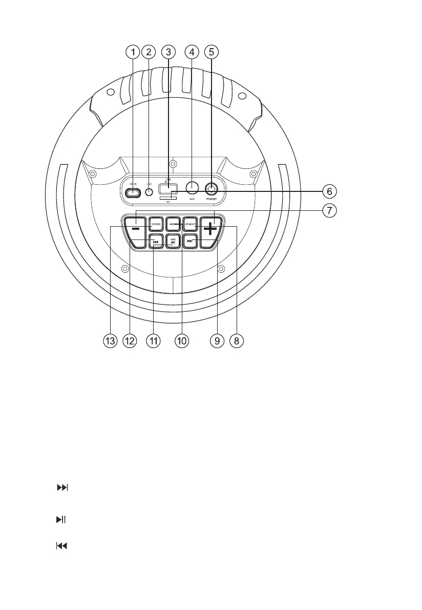 12. : Stlačte toto tlačidla pre presun na predchádzajúcu skladbu v režimoch USB/BT. Prepnite